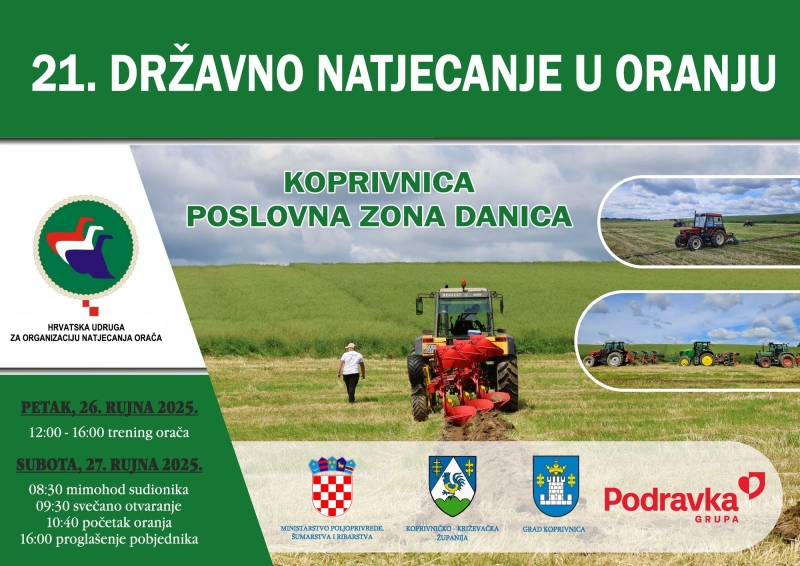 Koprivničko – križevačka županija i Grad Koprivnica će 26. i 27. rujna 2025. godine biti domaćin 21. Državnog natjecanja u oranju Republike Hrvatske, koje će se održati na Podravkinoj poljoprivrednoj parceli u industrijskoj zoni Danica.